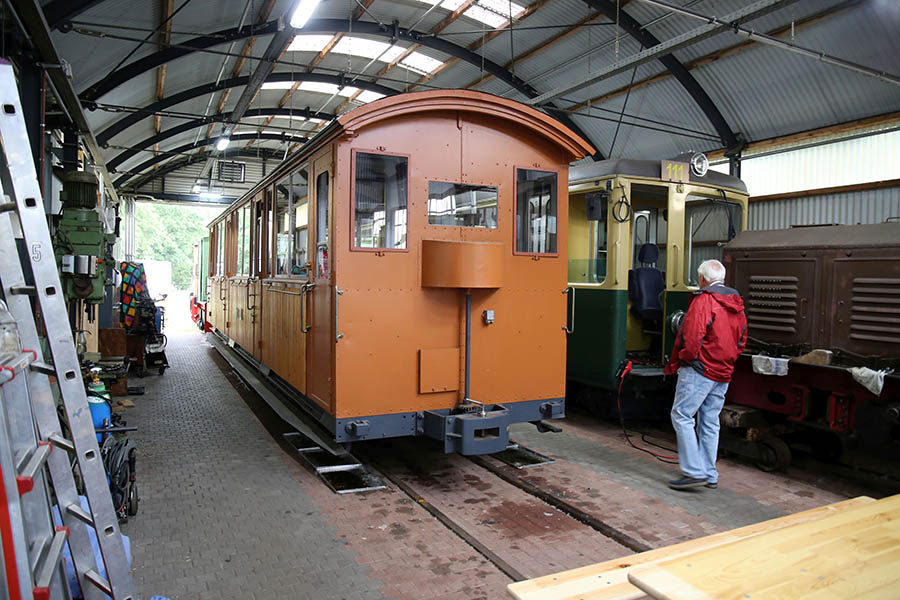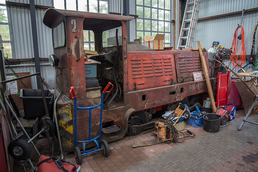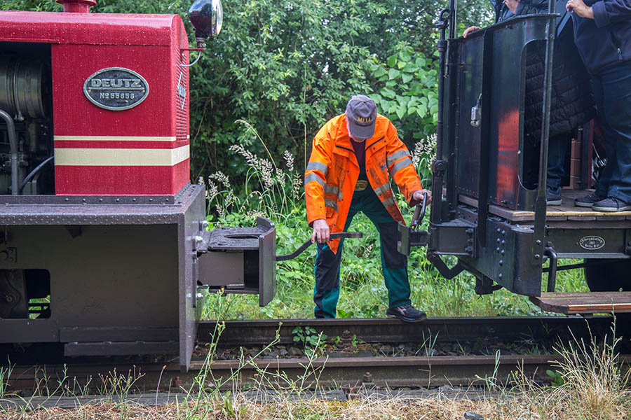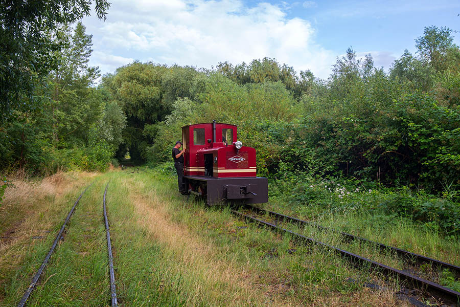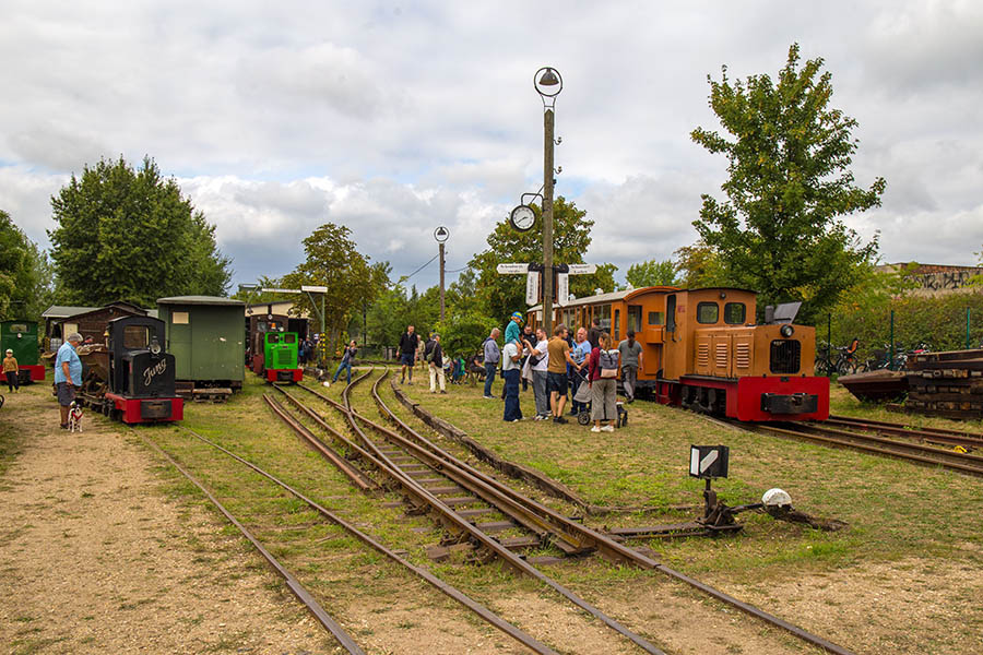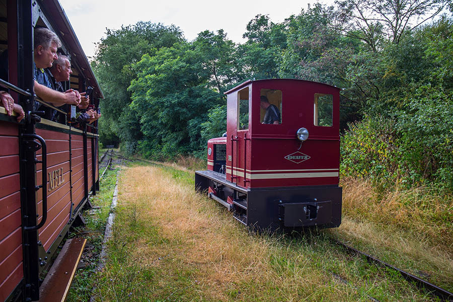 Der Verein sammelt Feldbahn-Dieselloks verschiedener Baureihen. Eine Augenweide ist ein Personenwagen, der 1906 bis 1930 auf einer Teilstrecke der Schweizer Wengeralpbahn fuhr. Eine Deutz-Lokomotive, die nach einer Sturmflut einst zum Deichbau eingesetzt wurde, holt der Verein sich von einem niederländischen Unternehmen. „An dieser Lok haben wir drei Jahre intensiv gearbeitet“, erzählt Vereinschef Veit Bruchmann. Etwa 30 Mitglieder hat der Verein, die in ihrer Freizeit viel werkeln und die Strecke vom Ästen und Grünwuchs freihalten. Die Fahrzeughalle ist ebenfalls selbst gebaut.