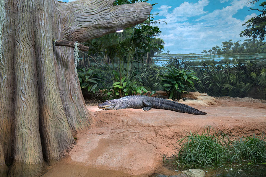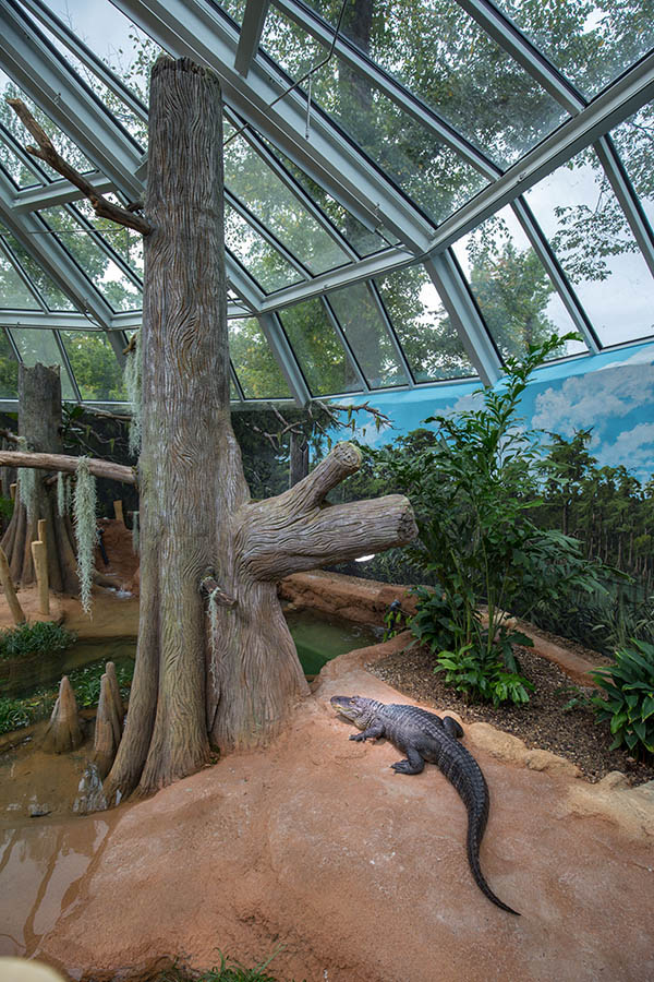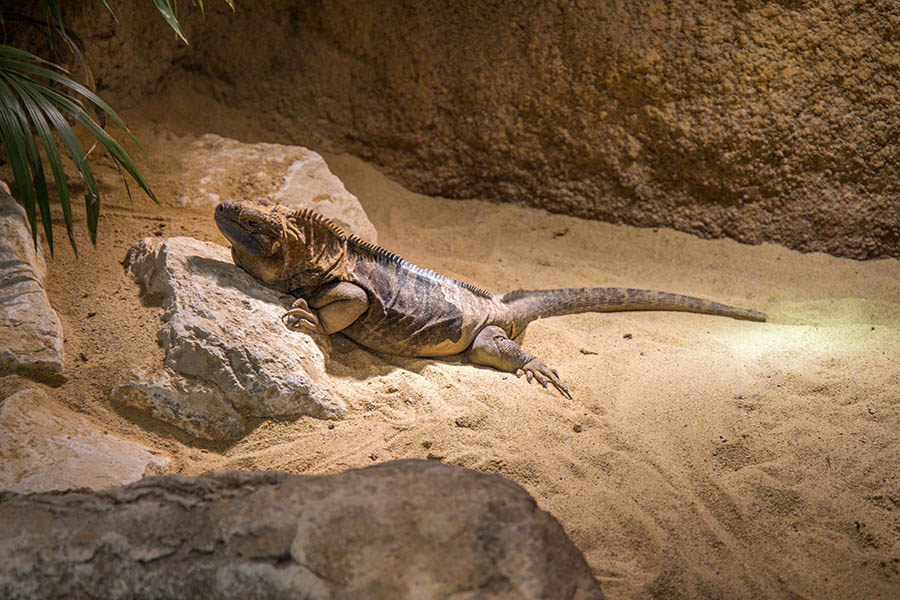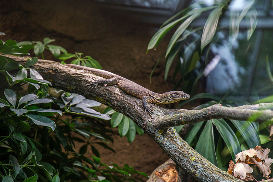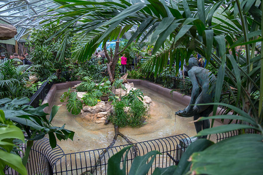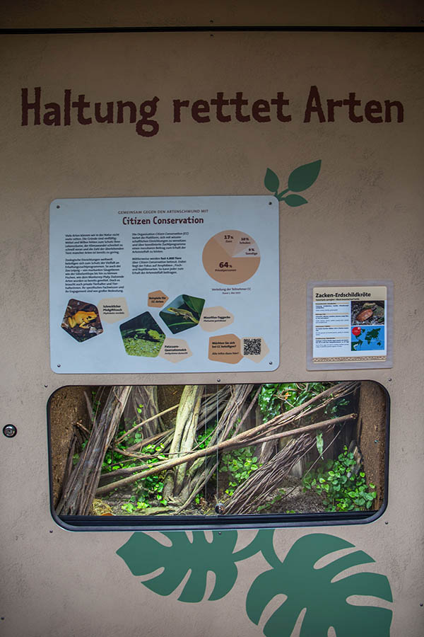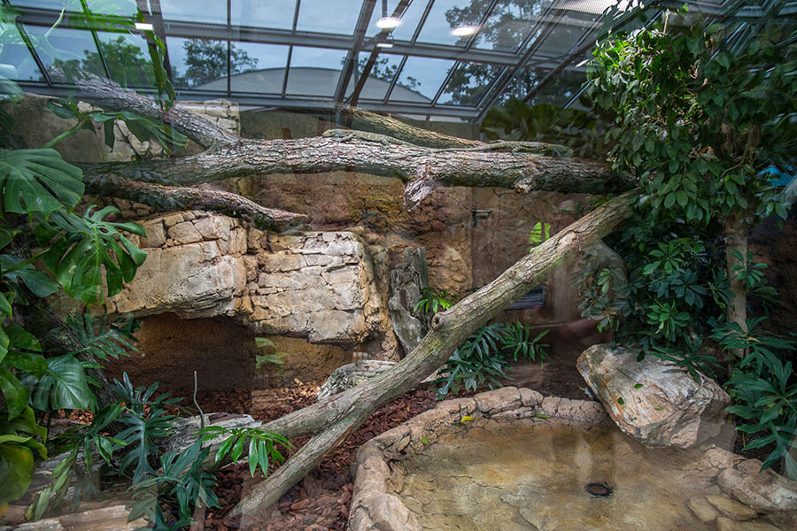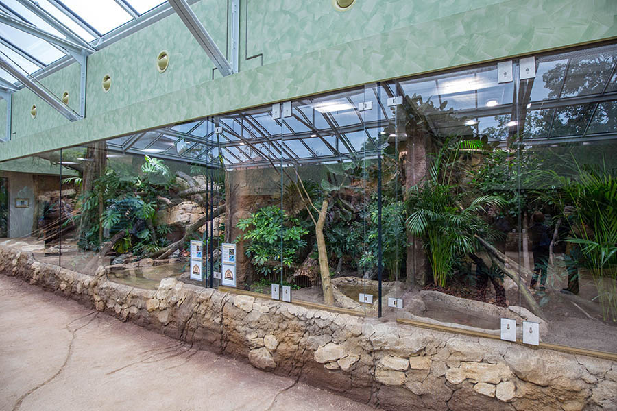 Die Temperatur beträgt etwa 25 Grad. Die Schaugehege wirken durch die durchgehende Glasfront größer und eleganter. Im großen Wasserbecken leben Stumpfkrokodile. Wer möchte, kann Kobras, Buschmeistern und Klapperschlangen bis auf wenige Zentimeter Abstand nahe kommen. Freilaufende Geckos sind im tropisch warmen Haus ebenfalls unterwegs. Aber auch Jamaika-Leguane, Mississippi-Alligatoren, Strahlenschildkröten, Querzahnmolche und viele andere Tiere gibt es im Terrarium zu entdecken. Darunter sind seltene Arten, die über Artenschutzprogramme des Netzwerks Citizen Conservation erhalten werden. Erläutert wird auch, wie Privatpersonen hochbedrohte Arten vor dem Aussterben schützen können.