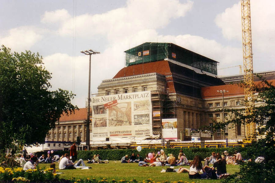 Nach dem Kriegsende 1945 genoss der Hauptbahnhof in der Sowjetischen Besatzungszone und in der DDR Priorität als Begleiter der Messe. Gleichwohl unterblieben aus finanziellem Mangel wichtige Investitionen. Ab 1990 liefen alle Bauvorhaben auf Rettung hinaus. Sie gelang mit der Integration der Promenaden Leipzig Hauptbahnhof, einer zum Flanieren einladenden Abfolge von 140 Einzelhandelsgeschäften und reichlich Gastronomie auf drei Ebenen. Zur Eröffnung im Herbst 1997 erschien Bundeskanzler Helmut Kohl. Anschließend begann die Sanierung der Bahnsteighallen. Damit war der Hauptbahnhof ab 1999 als ICE-Knoten herausgeputzt.