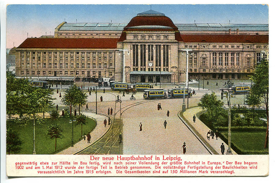 Auf dem weiträumigen Gelände der drei Vorgängerbahnhöfe und ab 1912 auch auf den ersten Abschnitten des Hauptbahnhofs stand der Bahnverkehr – dank geschickter Provisorien und perfekter Organisation – nicht einen Tag still. Nur der Beginn des 1. Weltkriegs machte den Planern einen Strich durch die Rechnung. Vor allem wegen Arbeitskräftemangels nach dem Beginn der Mobilisierung verzögerte sich die Fertigstellung des Hauptbahnhofs um ein Jahr. Allerdings stimmte die Gesamtrechnung: Mit 137 Mio. Mark fiel sie nur unwesentlich höher aus als die zunächst avisierten 135 Mio. Mark für die Umgestaltung der Leipziger Bahnanlagen, darunter als herausragender Einzelposten 60 Mio. Mark für Empfangsgebäude, Gleisanlagen und Bahnsteighallen des Hauptbahnhofs. Zur feierlichen Schlusssteinlegung am 4. Dezember 1915 in der sächsischen Bahnhofshalle blieben die deutschen Ehrengäste unter sich. Die Eröffnung des Hauptbahnhofs mitten im 1. Weltkrieg verhinderte die fällige Würdigung als Schlüsselereignis der europäischen Verkehrsgeschichte.