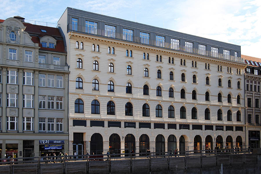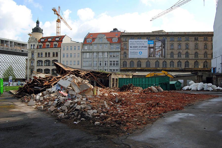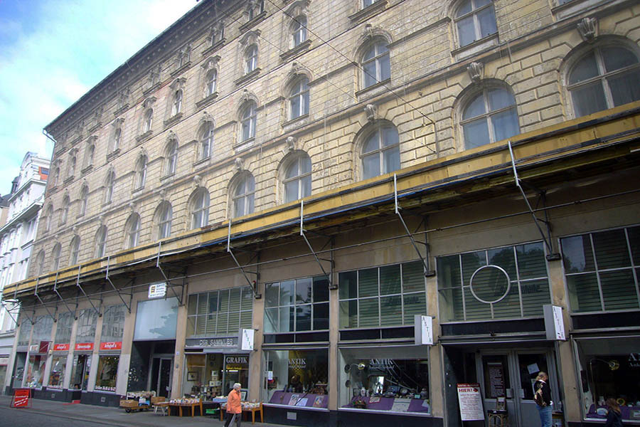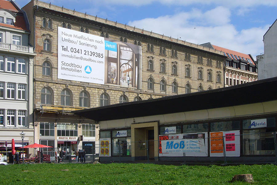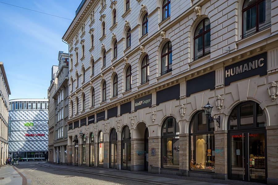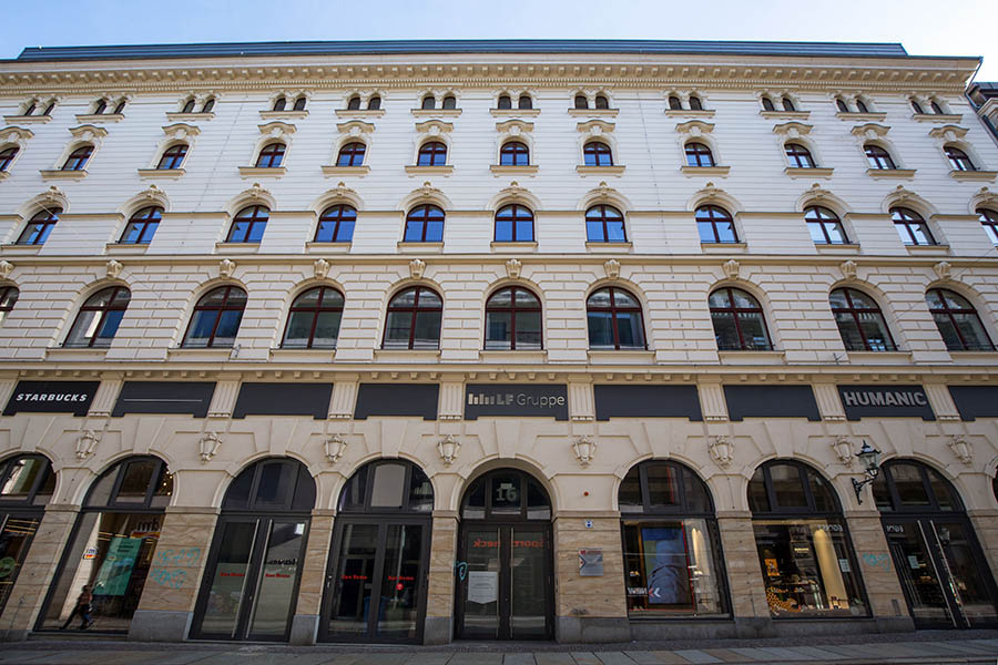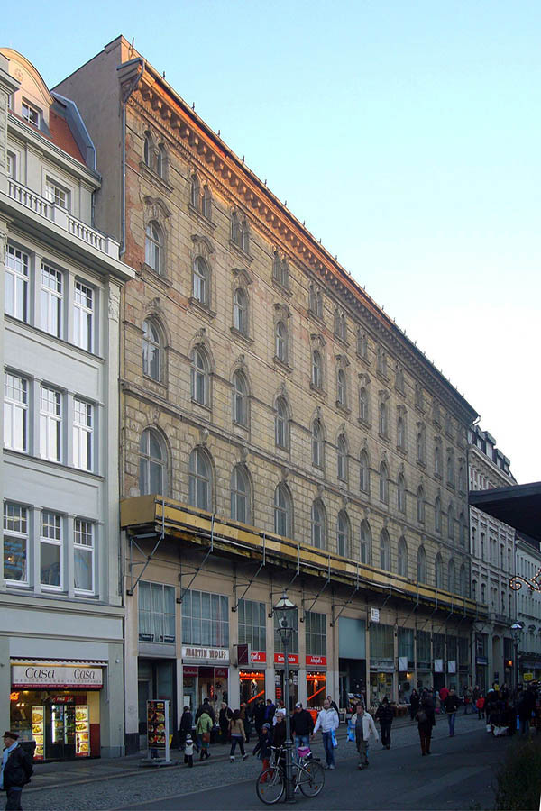 Im April 1890 hat der damalige Eigentümer Pläne, eine König-Albert-Passage zwischen Hain- und Katharinenstraße zu errichten. Doch Bauherr Anton Schmidt hat sich verspekuliert und muss Konkurs anmelden. Eine Berliner Bank übernimmt. Sie beauftragt den Leipziger Architekten Arwed Roßbach 1891/92 den Gebäudekomplex komplett zu erneuern. Realisiert wird davon aber nur die Fassade, die an den florentinischen Renaissancestil angelehnt ist. Im Inneren verewigt sich schließlich der Berliner Architekt Ludwig Heim, der in der Hauptstadt große Repräsentationsbauten schuf.