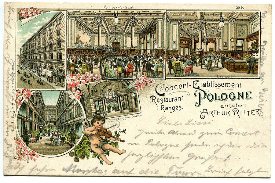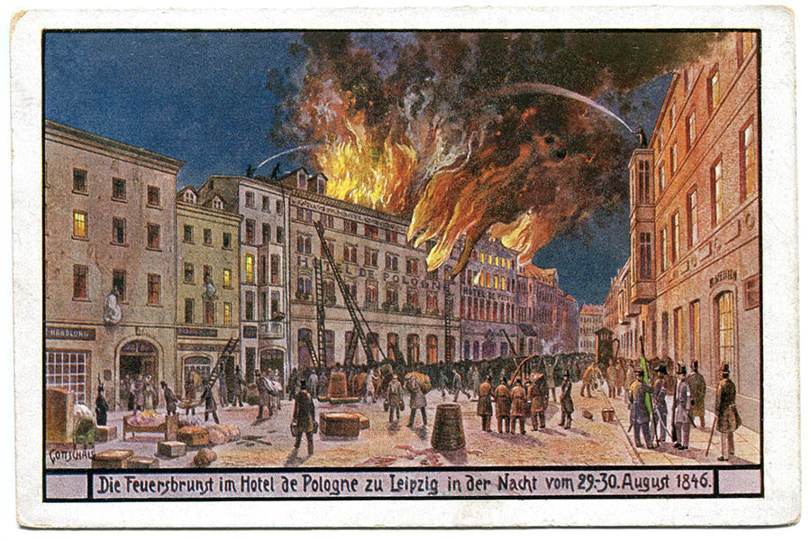 1843 vereint Pusch alle drei Häuser unter dem Namen Hôtel de Pologne. Dabei lässt er vom Architekten Eduard Pötzsch einen reich dekorierten Festsaal einbauen. Dieser wird allerdings bei einem Brand 1846, der alle drei Häuser in Mitleidenschaft zieht, zerstört.