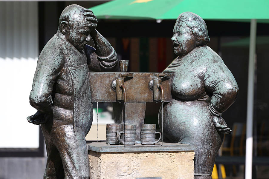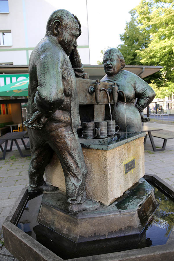 Die Bronzeplastik auf dem Brunnen schuf der Leipziger Bildhauer Peter Schremmer im Jahr 1986. Sie zeigt zwei sich streitende Wirtsleute, die am Ausschank eines Restaurants stehen. Aus den Zapfhähnen fließt das Wasser an den bronzenen Bierhumpen vorbei in den Brunnen. Die Szene deutet auf den Ort als belebten Treffpunkt hin und passt gut zur Kultur- und Gastronomiemeile Karl-Liebknecht-Straße.