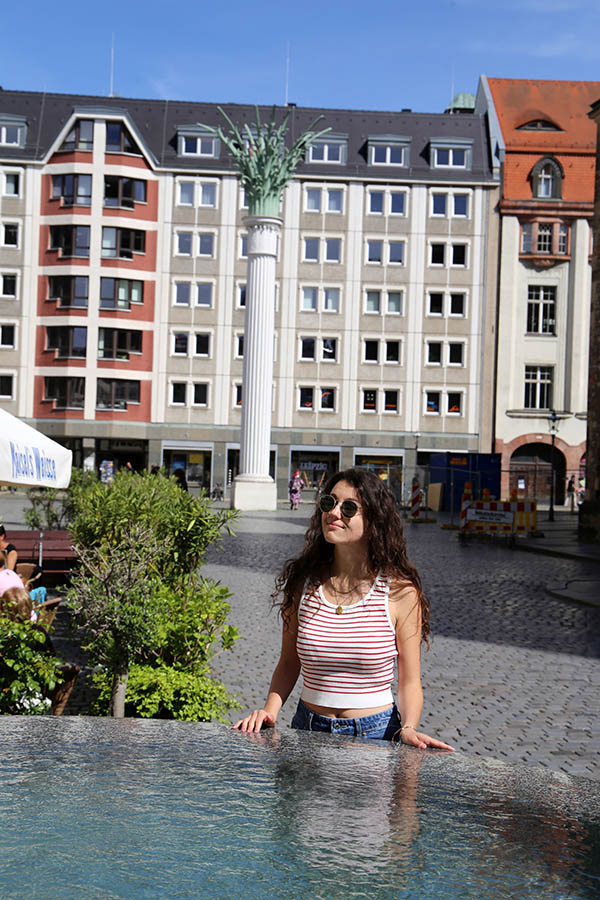 Gestalterisch ist der Brunnen durch eine stark reduzierte Formensprache geprägt. Er besteht aus einer kreisförmigen Brunnenschale mit 3,30 Metern Durchmesser aus hellem Lausitzer Granit, die auf einem runden Sockel ruht. Die leicht geneigte Schale sammelt das Wasser am Rand, das sichtbar über die Außenfläche abläuft. Der Wasserspiegel reicht bis zur Kante der Schale, so dass das Überfließen integraler Bestandteil des Erscheinungsbildes ist. Das kontinuierliche Überlaufen wirkt wie ein sprichwörtlich überlaufendes Fass und kann als Symbol für das wachsende Aufbegehren der Bürger gegen das Regime im Herbst 1989 verstanden werden. Zugleich schafft der Brunnen einen zurückhaltenden, offenen Raum, der zur Nutzung des Platzes einlädt und dessen historische Bedeutung unterstützt, ohne sich in den Vordergrund zu drängen.