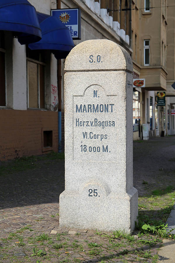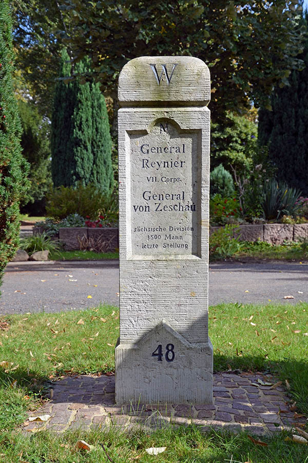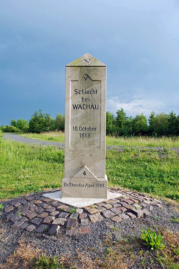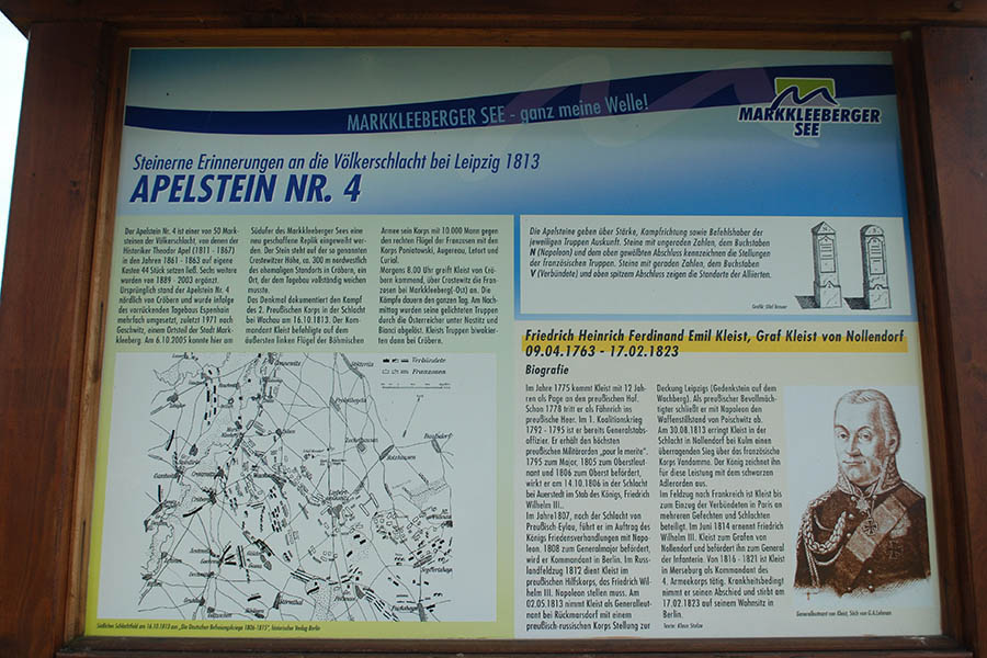 Apel`s Anliegen mit den nach ihm benannten Steinen, waren die markanten Standorte der verschiedenen Truppen, jedoch nicht im Sinne einer beeindruckenden Schlacht, sondern eher als Mahnmal an das damit verbundene Unheil. Dabei unterschied er die Verbündeten und die napoleonischen Truppen. Und das spiegeln die Steine wider. Sie alle sind etwa 1,50 Meter hohe viereckige Steinsäulen, auf deren oberen Ende die Himmelsrichtungen angegeben sind.