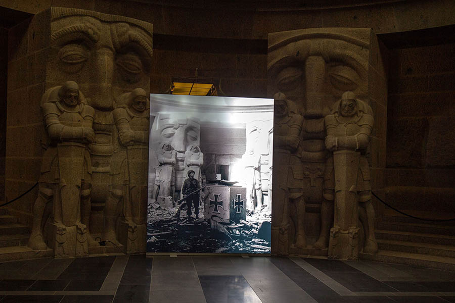 Eine weiße Flagge am Denkmal wird Symbol für das Ende des Zweiten Weltkrieges in Leipzig. Die Soldaten und Volkssturmmänner werden auf Laster verladen und in eines der Sammellager für Kriegsgefangene gebracht. Die Hitlerjungen werden zumeist nach Hause geschickt.