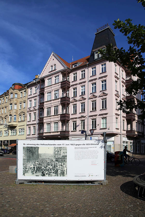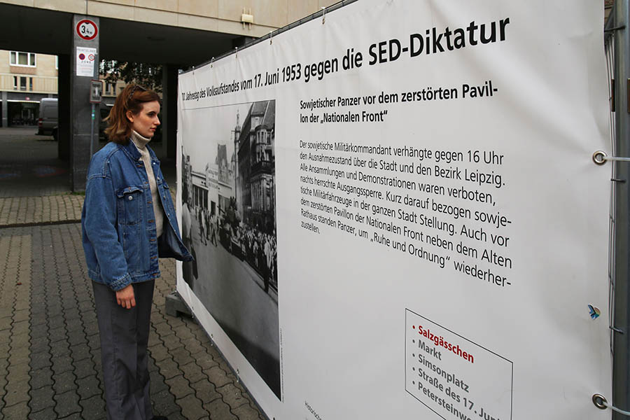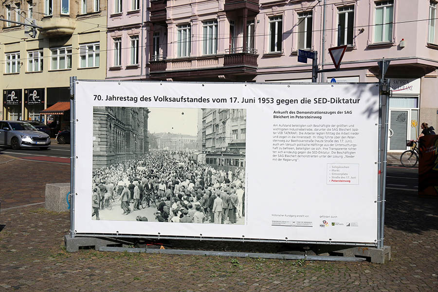 Wie in Berlin streiken schon am 16. Juni 1953 einzelne Leipziger Betriebe. Acht Jahre nach dem Ende des Zweiten Weltkrieges sind die Beschäftigten unzufrieden, erheben sich gegen das politische System in der DDR. Sie fordern die Rücknahme von Normerhöhungen, die Senkung der Preise für Lebensmittel und alltägliche Waren, aber auch freie Wahlen. Einen Tag später marschieren Belegschaften von Baustellen und Industriebetrieben ins Leipziger Zentrum. Arbeiter und Angestellte aus mehr als 80 Betrieben beteiligen sich. Auf dem Karl-Marx-Platz (heute: Augustusplatz) versammelt sich eine große Menschenmenge.