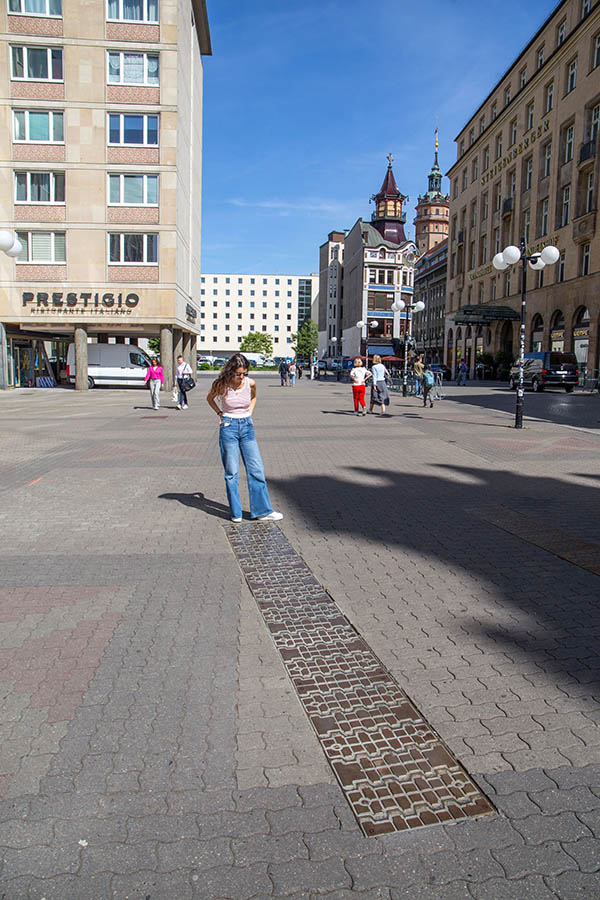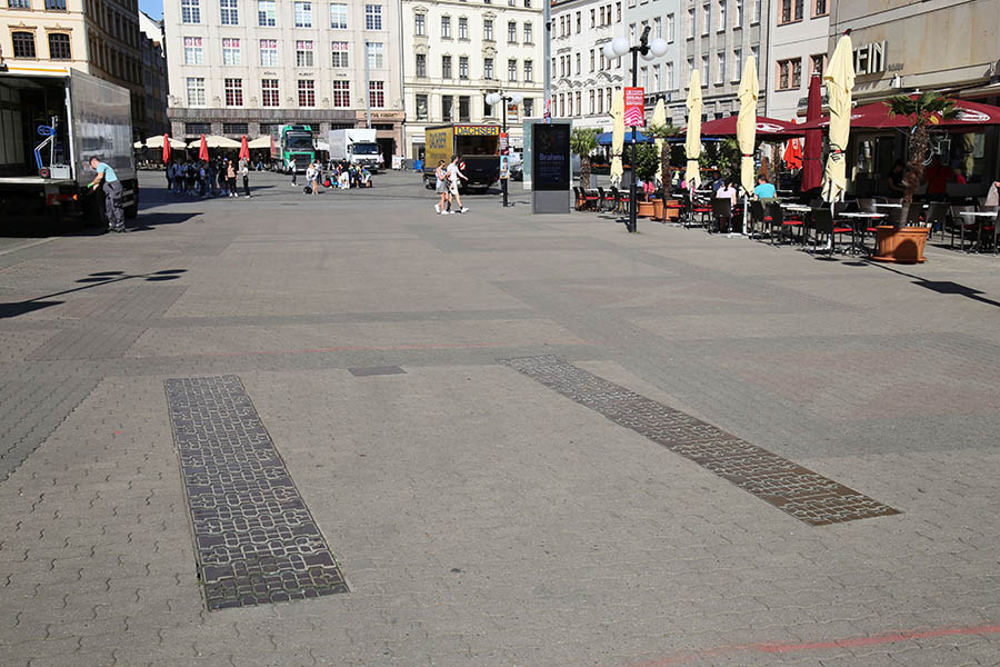 Sie sind recht unscheinbar: Zwei Panzerspuren – ins Pflaster eingelassene Bronzetafeln im Salzgäßchen – erinnern an ein Ereignis, das zu DDR-Zeiten lange totgeschwiegen wird: den Volksaufstand vom 17. Juni 1953, an dem auch Leipzig im Ausnahmezustand ist. Damals steht an jener Stelle im Salzgäßchen ein Pavillon der Nationalen Front, zu der alle zugelassenen Parteien und Massenorganisationen der DDR gehören. Er wird von Demonstranten zerstört – ein sowjetischer Panzer vom Typ T-34 fährt auf, um die Proteste zu beenden. An die damaligen Geschehnisse erinnert heute im Salzgässchen das Denkmal der Panzerspuren.