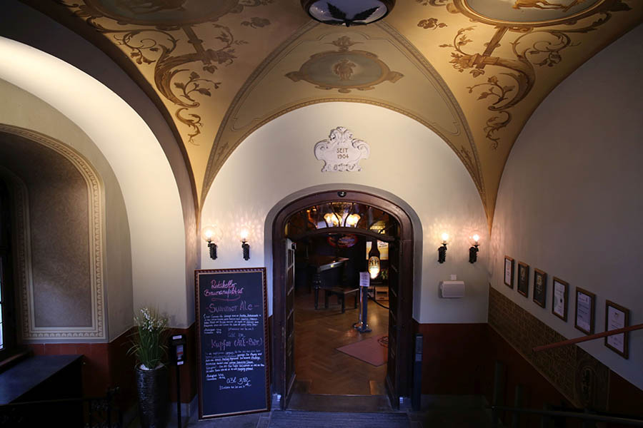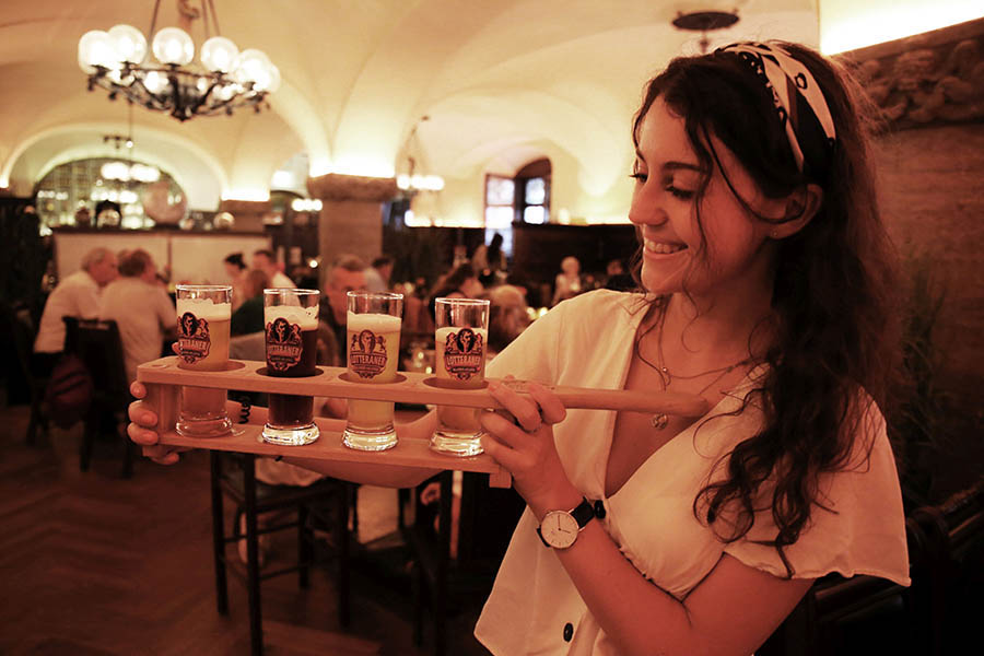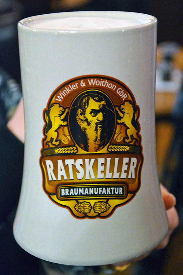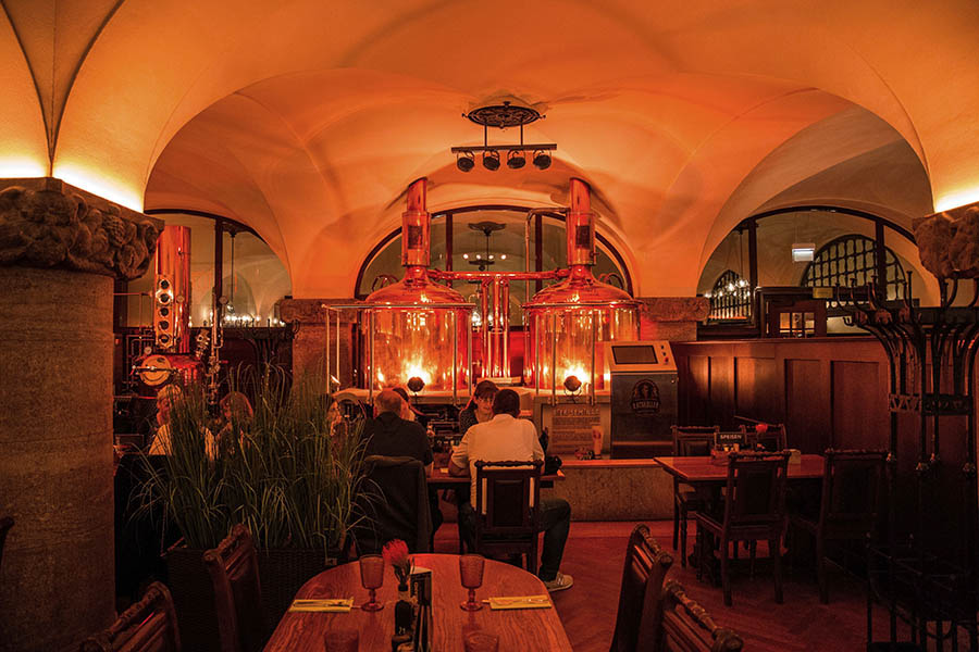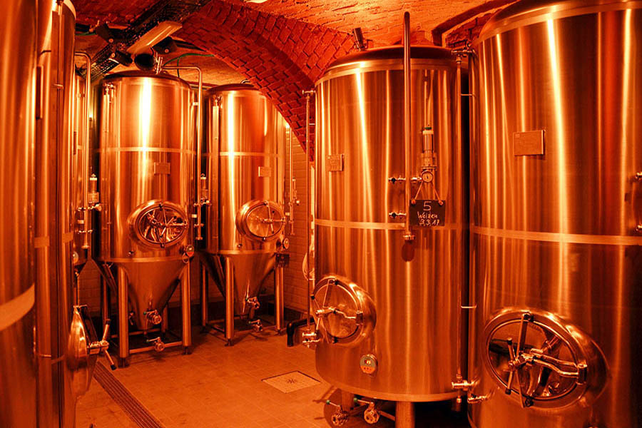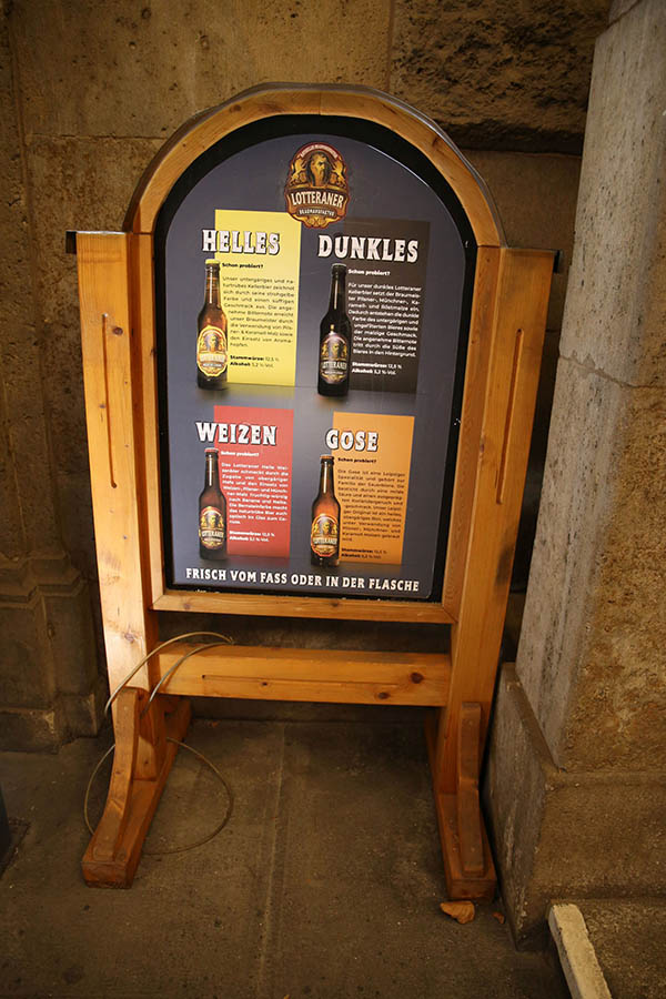 Im Gewölbe stehen 13 Gär- und Lagertanks, in denen das Bier bei zwölf Grad in sechs Wochen trinkfertig reift. Selbstverständlich nach deutschem Reinheitsgebot. Neben Hellem, Schwarzem und Weizen gibt es ein wechselndes Spezialbier, oft auch Gose. Wer möchte, kann in einem Probierset die aktuellen Biersorten kosten.