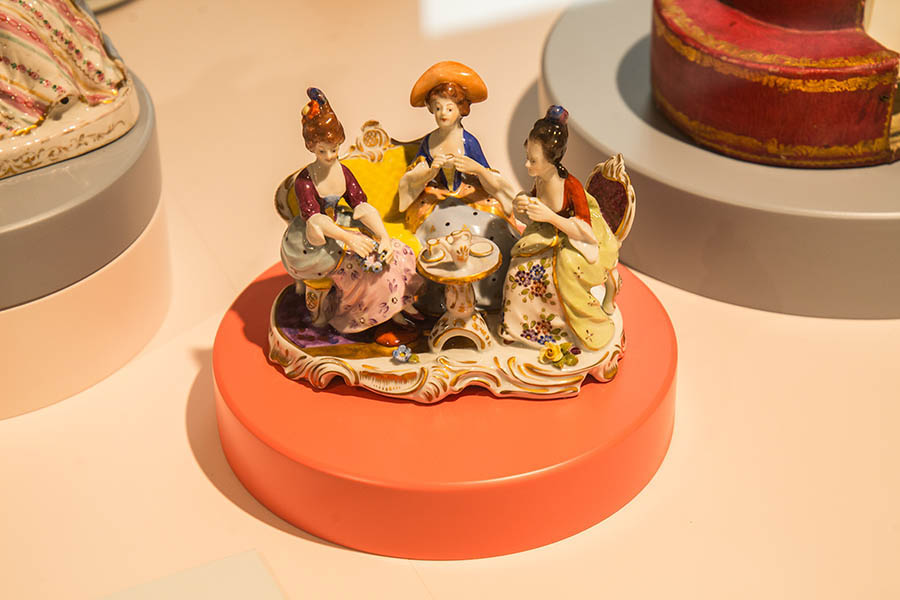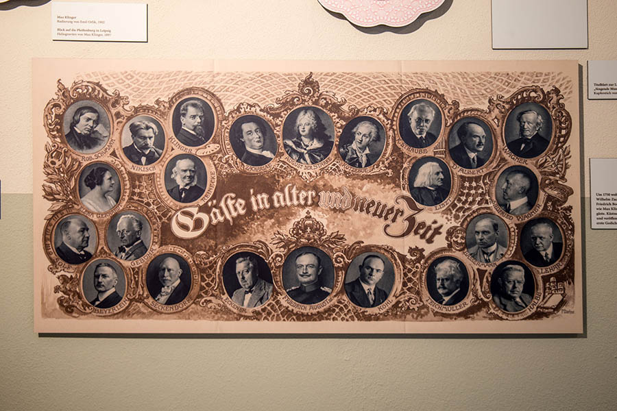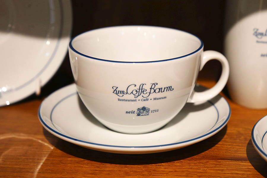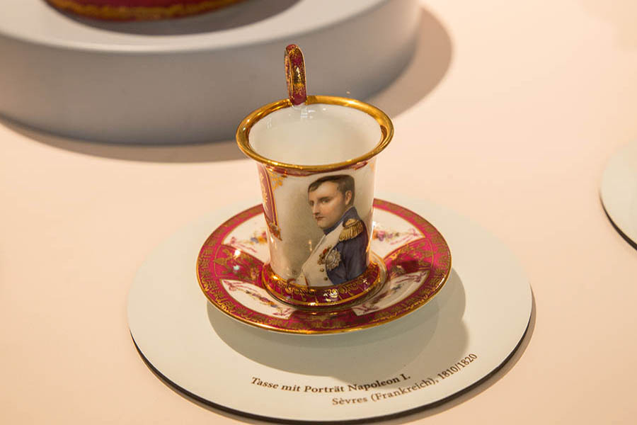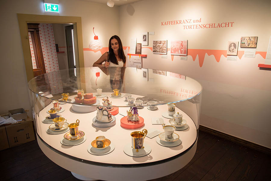 Beispiele für hochwertiges Porzellan, ob nun mit Ansicht der Thomaskirche oder mit Wappen der Universität Leipzig, sind verschiedene zu sehen. Eindrucksvoll ist die sogenannte Barttasse. Damit die männliche Zierde beim Schlürfen des Kaffees nicht „baden gehen“ muss, wird für Männer Ende des 19. Jahrhunderts eine Barttasse mit eingelegtem Steg entwickelt.