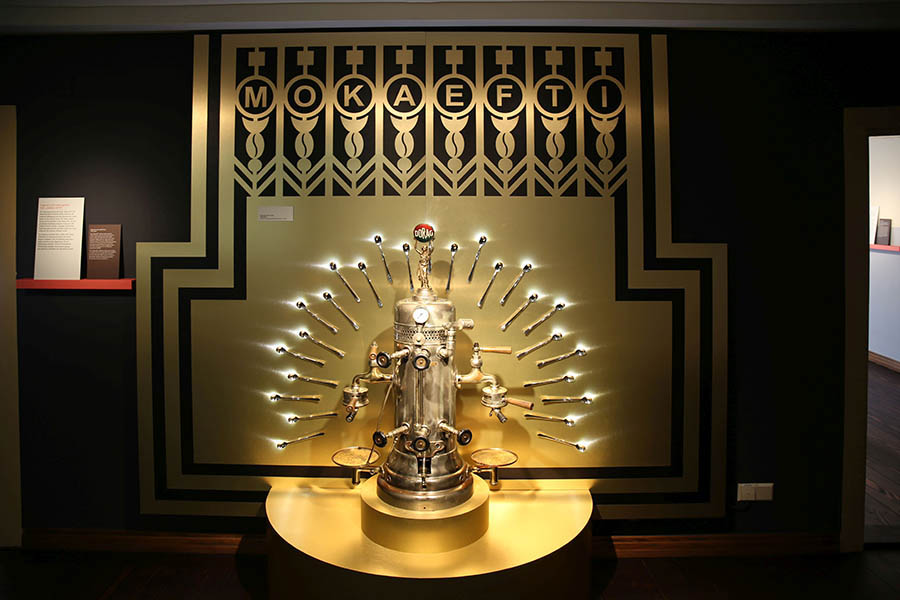 Ein Hingucker ist die legendäre „Moka Efti“. Das ist eine Espressomaschine, die von der Glanzzeit der Kaffeehäuser in den 1920er Jahren erzählt. Das gezeigte Exemplar stammt aus Berlin.