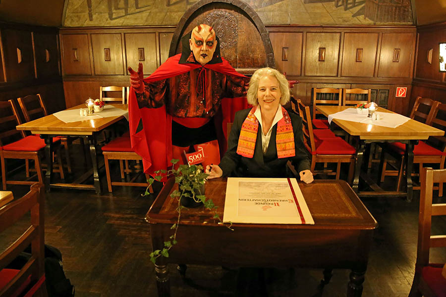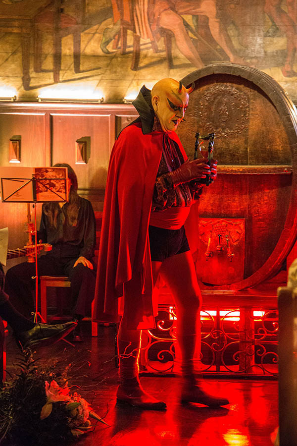 Seitdem jagt Müller mit seiner Donnerstimme so manchem Gast zunächst einen Schrecken ein. „He, Platz da! Sagt, was treibt Ihr hier?“ Sobald diese Worte ertönen, haben die Gäste ihre unheimliche Begegnung – mit Mephisto, dem Teufel. Er geht von Tisch zu Tisch, mit roten Beinkleidern, spitzen roten Stiefeletten, rotem Umhang und bemaltem Gesicht. Konfrontiert die Gäste mit Lastern, Schwächen und kleinen Unredlichkeiten, erteilt ihnen schließlich die teuflische Absolution.