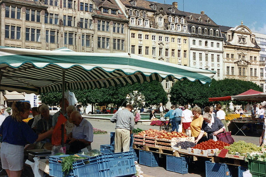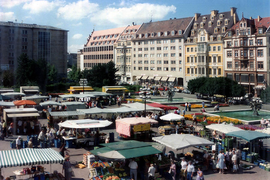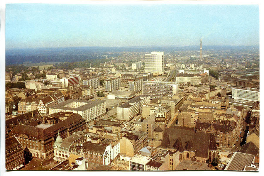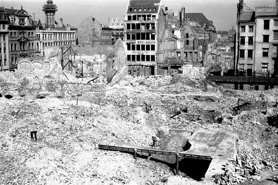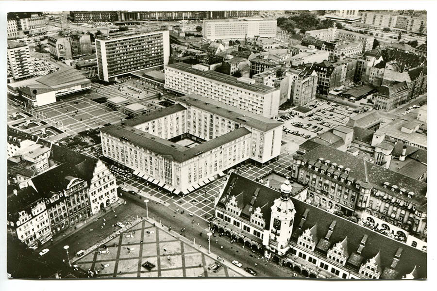 Das Häuserkarree zwischen Salzgäßchen und Brühl gehört bis in die 1940er Jahre hinein zu den am eng bebautesten Gebieten in der ganzen Stadt Leipzig. Das ändert sich schlagartig mit dem schweren Luftangriff der Alliierten am 4. Dezember 1943. An jenem Tag werden die Häuser weitestgehend dem Erdboden gleichgemacht. Auch das Zimmermannsche Kaffeehaus, in dem einst Johann Sebastian Bach mit seinem studentischen Collegium musicum zu Konzerten aufspielt, gehört zu den Bombenopfern.