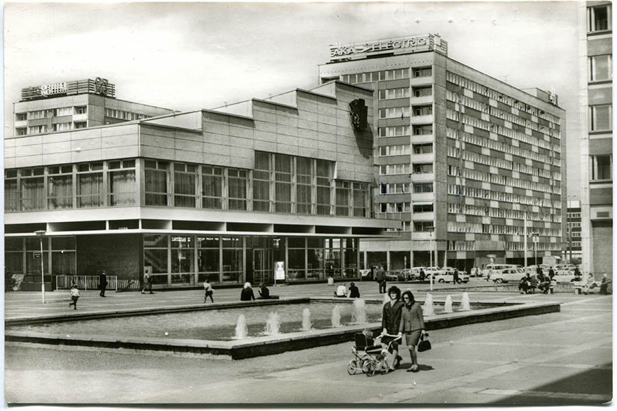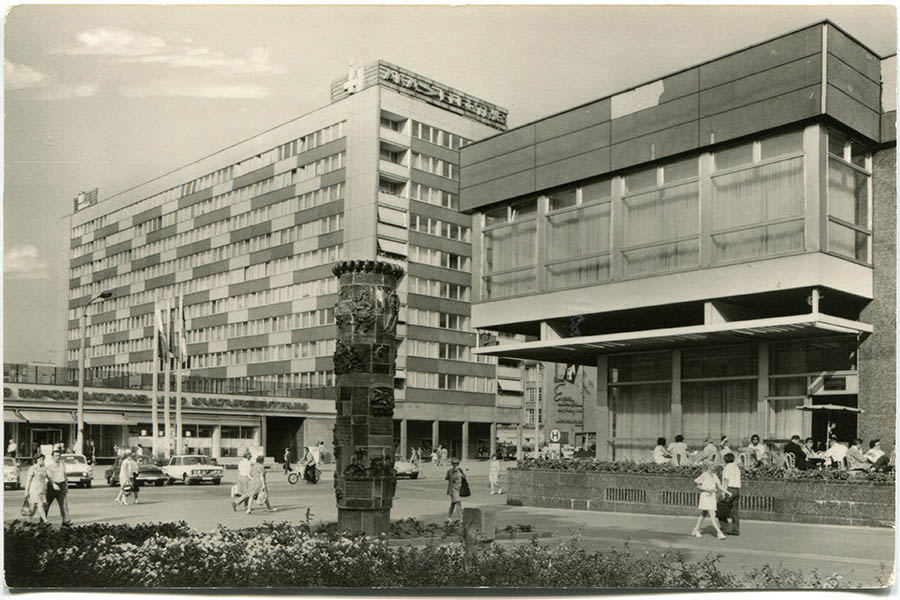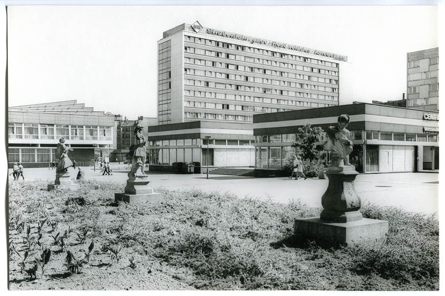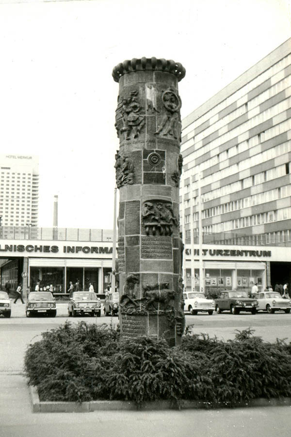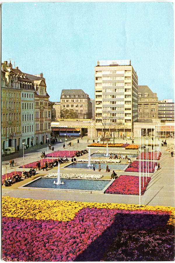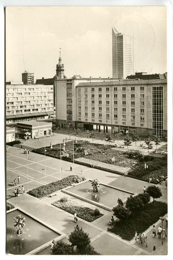 In der Mitte des Platzes entsteht eine große Freifläche, an der Seite zur Katharinenstraße kleinere Grünanlagen sowie drei Becken mit Wasserspielen. Ursprünglich sind es Fontänen, die ab 1971/72 von den Pusteblumen-Brunnen ersetzt werden. So nennt der Volksmund die bekannten Springbrunnen von Harry Müller, die inzwischen auf dem Richard-Wagner-Platz stehen. Markant ist eine fünf Meter hohe Keramiksäule, die Ereignisse der Leipziger Stadtgeschichte darstellt. Die hat der Künstler Herbert Viecenz 1972 geschaffen. Bei der Neubebauung des Areals wurde die Säule, die eigentlich eingelagert werden sollte, abgerissen. Die Keramikteile sind fest mit dem Betonkern verbunden, eine Bergung war nicht möglich. Viecenz gibt sein Kunstwerk daher schweren Herzens für den Abriss frei.