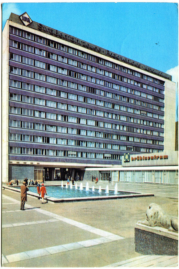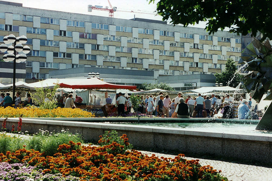 Als ein markantes Gebäude ist auf dem Sachsenplatz das Ausstellungs- und Informationszentrum mit fächerförmigem Dach entstanden, das als Leipzig-Information touristische Dienstleistungen anbietet. Gebaut wird ein Stahlskelettbau mit großer gläserner Fassade. Er beherbergt auch die Mokka-Bar. Im Obergeschoss bietet die Leipzig-Information neben einem Kinosaal weitere Konferenz- und Veranstaltungsräume an. Die Reichsstraße wird zur Fußgängerzone umgestaltet. Dort werden drei Ladenpavillons angeordnet.