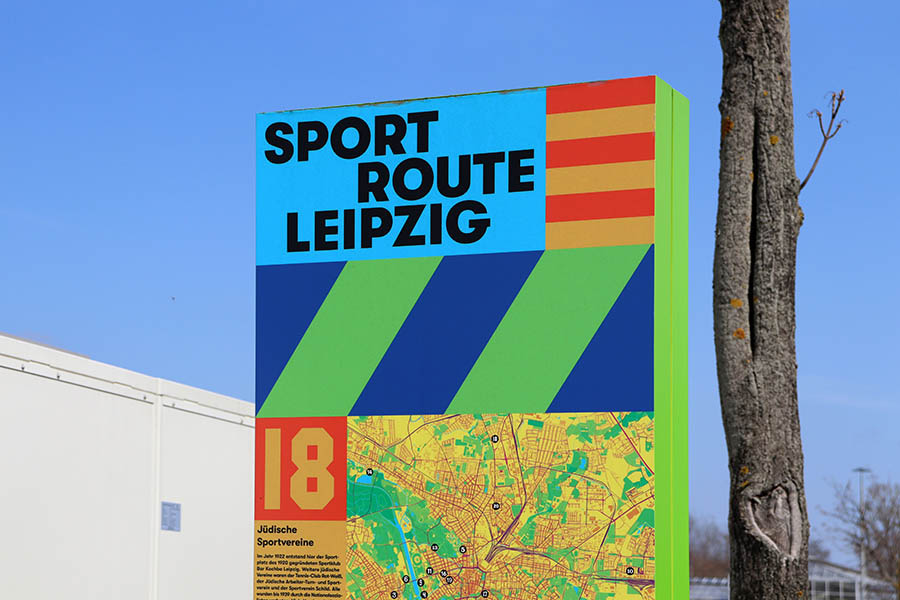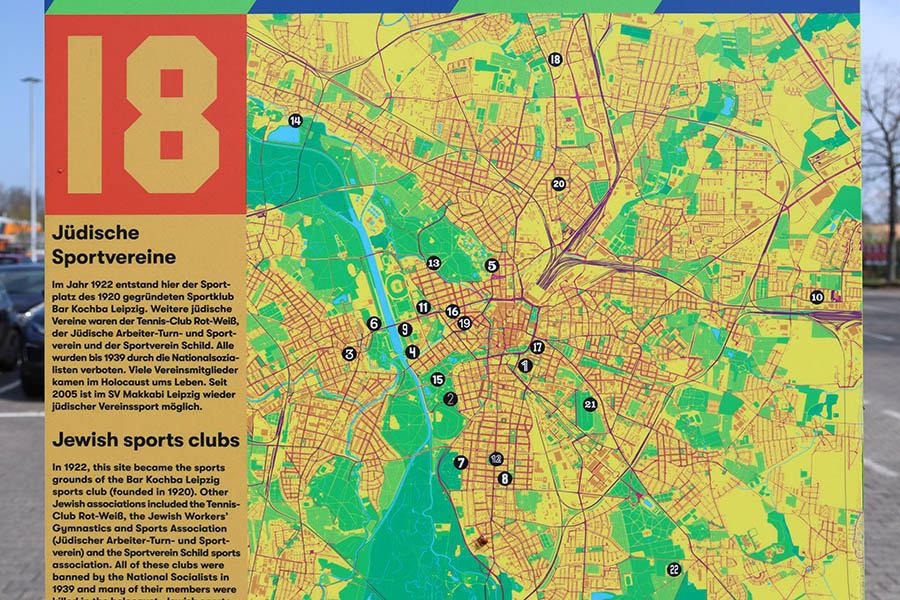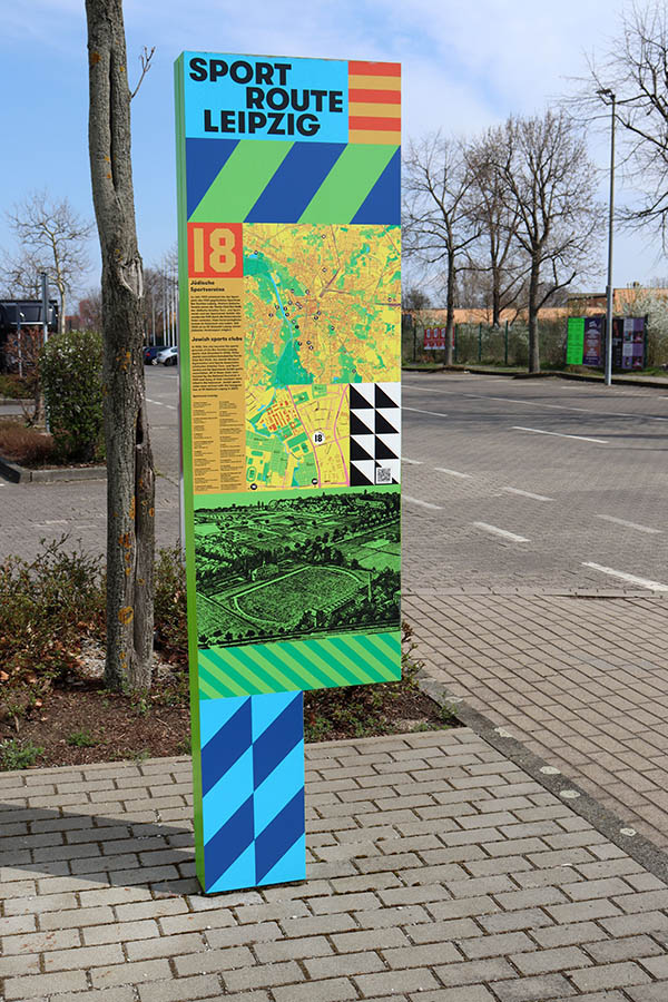 Station 18: Auf dem ehemaligen Sportplatz des Vereins Bar Kochba, gegenüber der Delitzscher Straße 133, wird an jüdische Sportvereine erinnert. Auf der 1922 errichteten Sportstätte des jüdischen Turn- und Sportvereins wird Fußball, Handball und Leichtathletik betrieben. 1932 und 1935 finden auf dem Platz die Deutschen Makkabi-Meisterschaften in der Leichtathletik statt. Die Mitglieder von Bar Kochba werden Opfer der nationalsozialistischen Politik zur „Arisierung“ Deutschlands. Viele ihrer Mitglieder kommen durch den Holocaust ums Leben. Bar Kochba muss sich 1938 auflösen. Auf seiner Sportstätte werden Baracken für Zwangsarbeiter errichtet. Seit 2005 gibt es mit dem SV Makkabi Leipzig wieder einen jüdischen Sportverein.