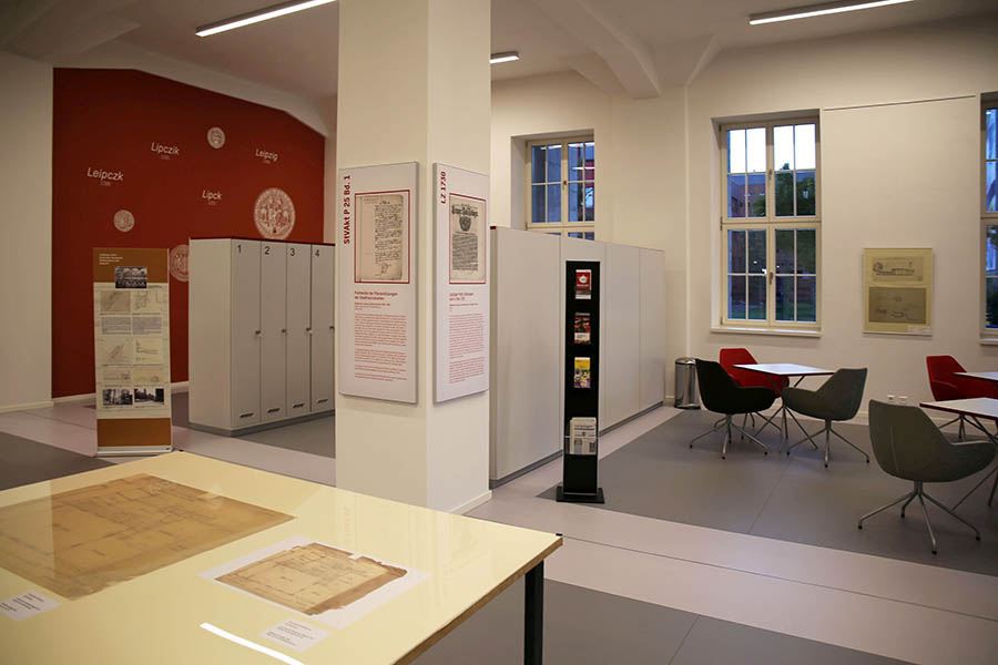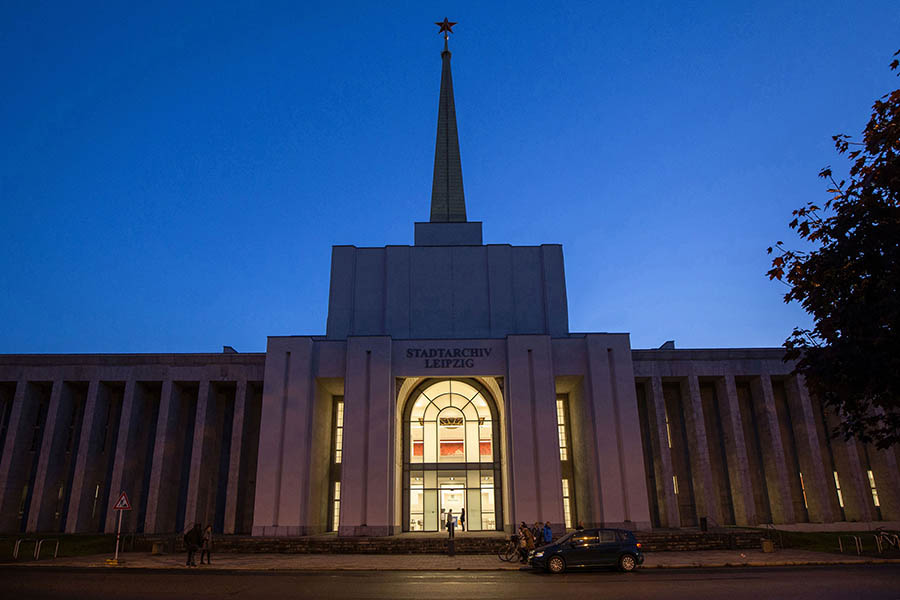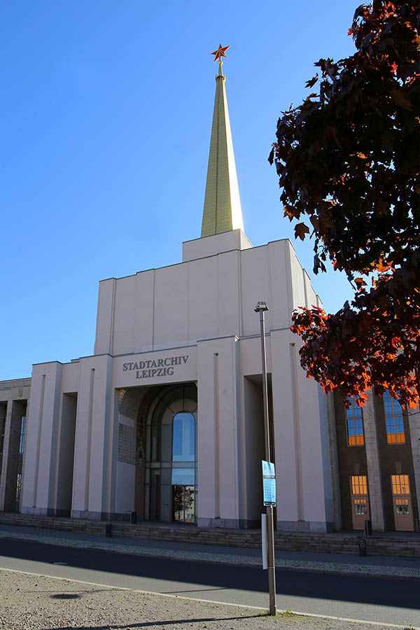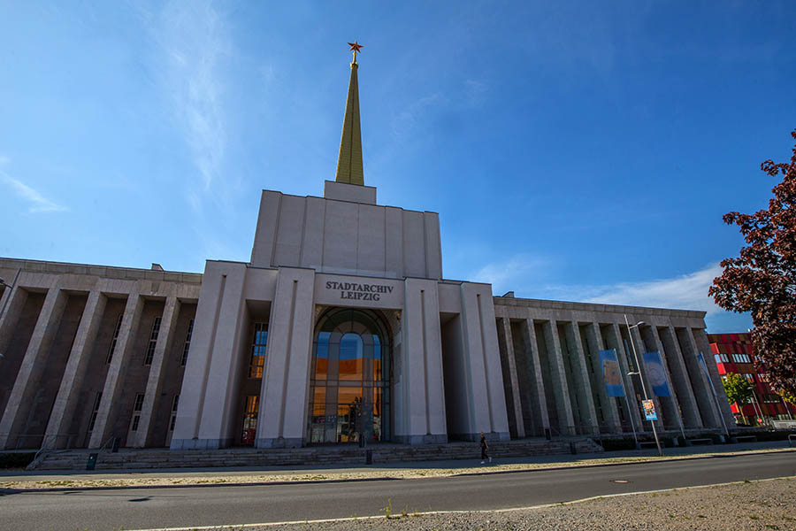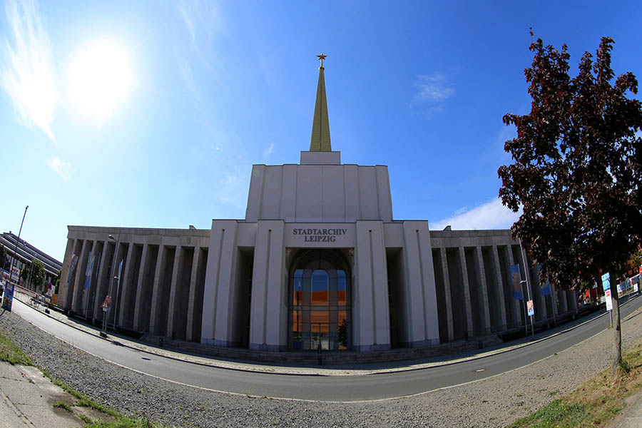 Es ist wie ein Stern am Archivhimmel: Im ehemaligen Sowjetischen Pavillon mit dem roten Stern auf der Alten Messe hat Leipzigs historisches Stadtgedächtnis seinen Sitz. Wo die Sowjetunion einst ihre Messegüter ausstellt, sind nun unter besten klimatischen Bedingungen Leipzigs Schätze, etwa der fragile Stadtbrief, untergebracht. Rund drei Jahre hat es gedauert, die ehemalige Messehalle als Stadtarchiv Leipzig auszubauen. Der Magazin-Zweckbau bietet Platz für rund 20 Regalkilometer Archivgut auf 8.200 Quadratmetern. Weil das perspektivisch nicht ausreicht, drehen sich bereits in der benachbarten Messehalle 12 die Kräne. Dort entsteht ein Verwaltungssitz für das städtische Jugendamt sowie weitere Archivflächen, die dann bis mindestens 2050 ausreichen sollen. Das Stadtarchiv besitzt einen Veranstaltungssaal, der den Namen des ehemaligen Stadtchronisten Gustav Moritz Wustmann (1844 bis 1910) trägt. Der Saal ist mit modernster Technik ausgestattet und fasst bis zu 100 Personen. Als Magazin bewahrt das Stadtarchiv Unterlagen der Leipziger Stadtverwaltung sowie nichtamtliches Schrift- und Sammlungsgut aus verschiedenen Bereichen, das von bleibendem Wert für die Geschichte Leipzigs ist.